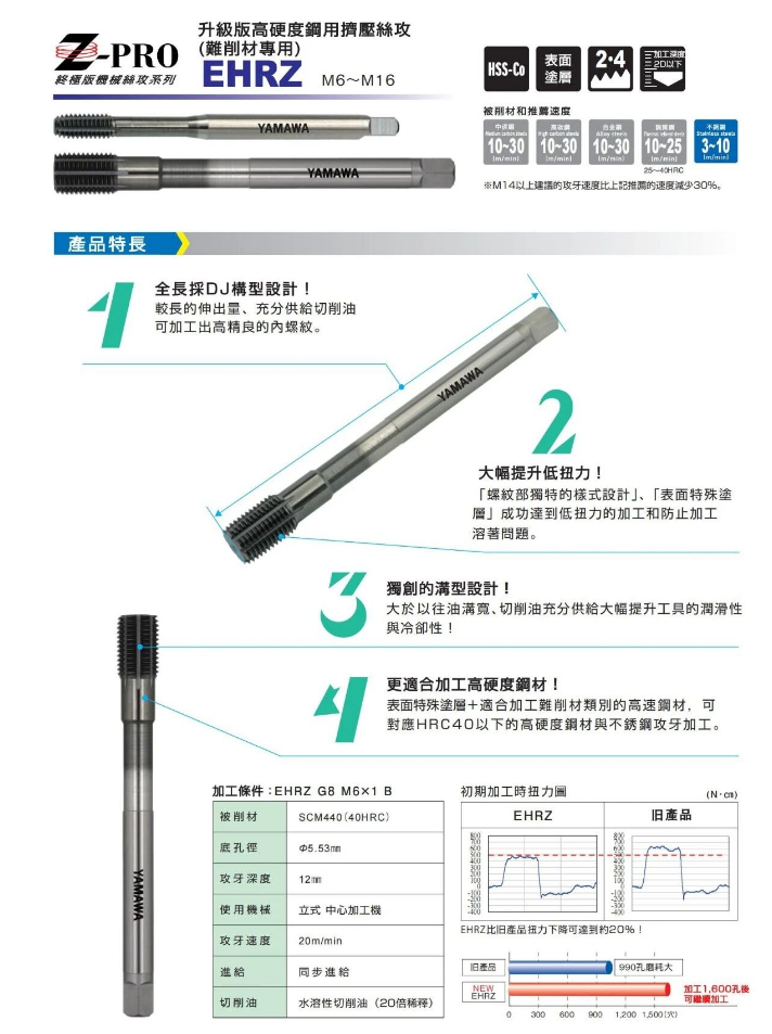 YAMAWA Z-PRO EHRZ 专门加工更硬度碳钢、合金钢(~HRC40)难削材专用挤压丝攻!